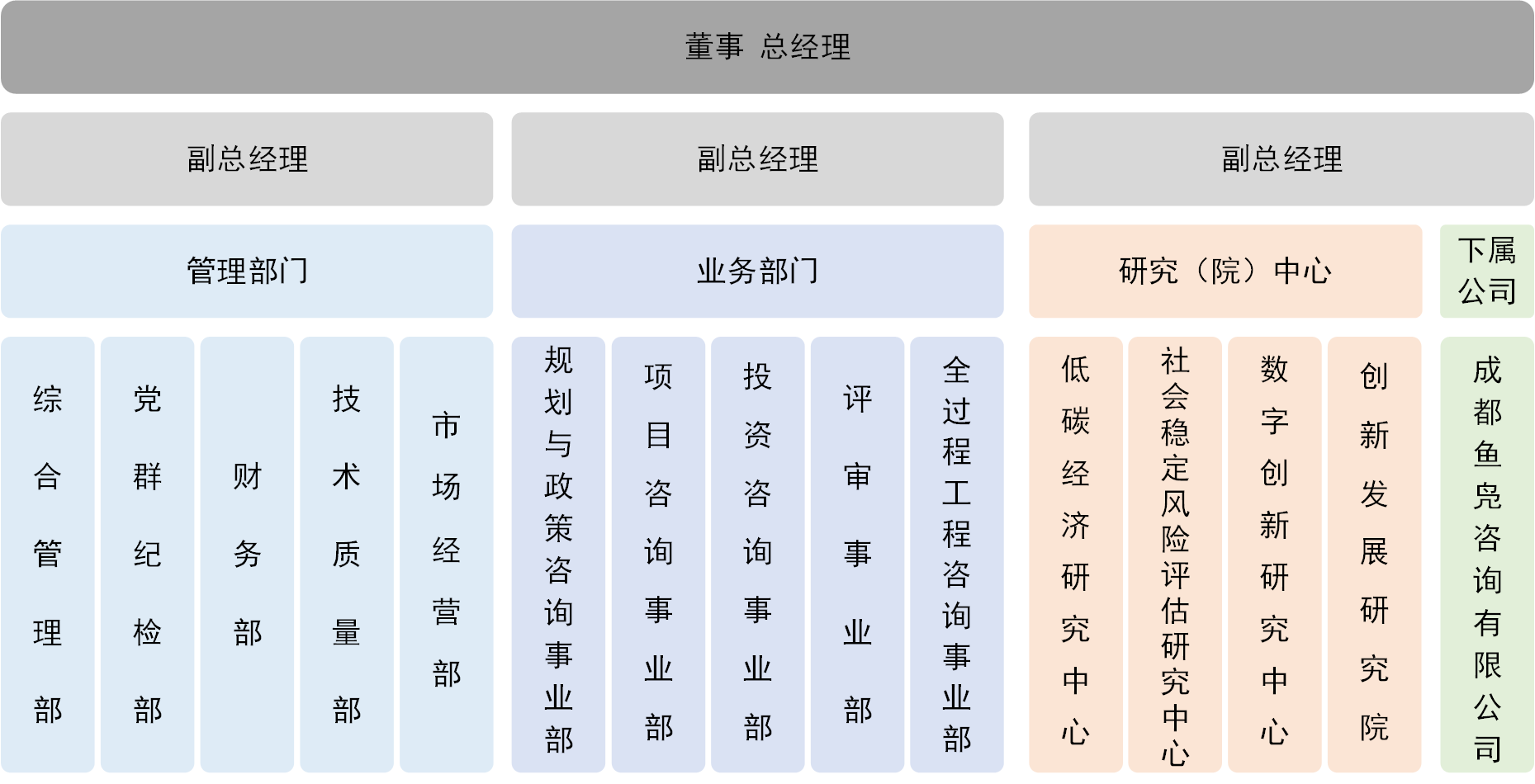 公司本科及以上學(xué)歷員工占比93%,碩士及以上學(xué)歷員工占比47%;正高級(jí)工程師7人,高級(jí)工程師28人,擁有全國(guó)咨詢工程師(投資)、全國(guó)注冊(cè)造價(jià)工程師以及注冊(cè)城鄉(xiāng)規(guī)劃師等各類專業(yè)技術(shù)資格人才占比超過65%。公司下設(shè)11個(gè)部門,4個(gè)研究(院)中心。其中,業(yè)務(wù)部門6個(gè),包括規(guī)劃與政策咨詢事業(yè)部、項(xiàng)目咨詢事業(yè)部、投資咨詢事業(yè)部、評(píng)審事業(yè)部、造價(jià)咨詢事業(yè)部和項(xiàng)目管理事業(yè)部;4個(gè)研究(院)中心分別為低碳經(jīng)濟(jì)研究中心、社會(huì)穩(wěn)定風(fēng)險(xiǎn)評(píng)估研究中心、數(shù)字化創(chuàng)新研究中心和創(chuàng)新發(fā)展研究院。為推動(dòng)行業(yè)數(shù)字化、智能化轉(zhuǎn)型發(fā)展,公司還與西南交通大學(xué)經(jīng)濟(jì)管理學(xué)院共建工程咨詢智能決策研究中心和產(chǎn)學(xué)研合作示范研究基地。公司現(xiàn)有控股子公司1家,為公司與溫江區(qū)屬國(guó)有公司合資成立的成都魚鳧咨詢有限公司。